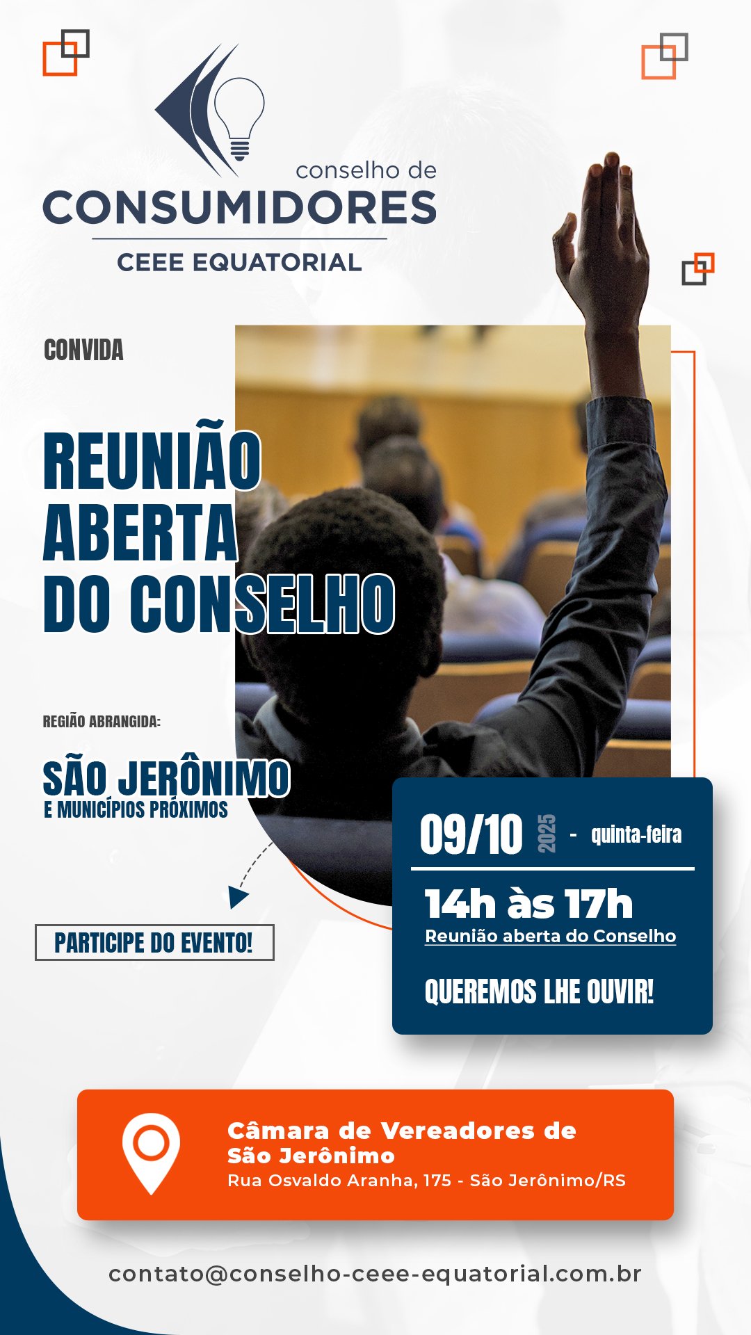 Você também pode entrar em contato via e-mail: contato@conselho-ceee-equatorial.com.br.